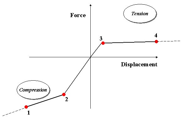 The curves are always defined from the very left side (3'rd qudrant) towards right (1'st quadrant) as indicated above. The curve may have any shape, and different behaviour in tension (1'st quadrant) and compression (3'rd quadrant) is possible. F ex: A simple contact spring is obtained by specifying ~Zero tension capacity and relatively high stiffenss in compression (too high stiffness might cause numerical problems!).